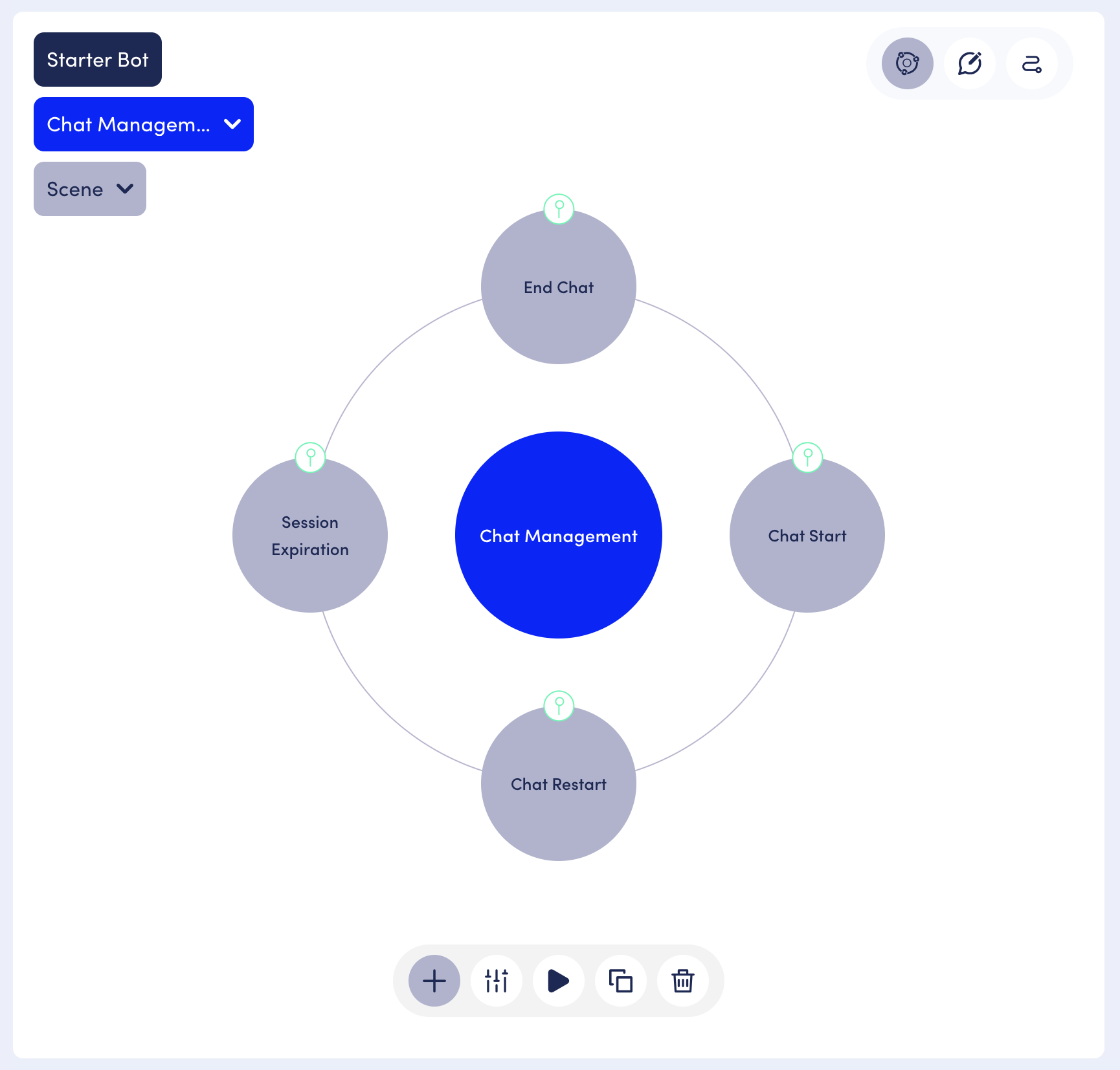 The Chat Management conversation is a Starting conversation. It contains scenes, turn and intents that handle chat management functionality. The green dots on top of the Scenes indicate that all of these Scenes also have the Starting behavior. Finally, the turns within the scenes are also Starting turns.
