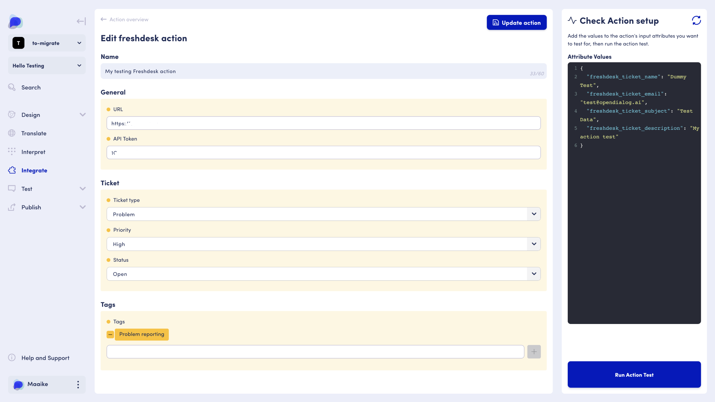 Learn how to create and test a Freshdesk action