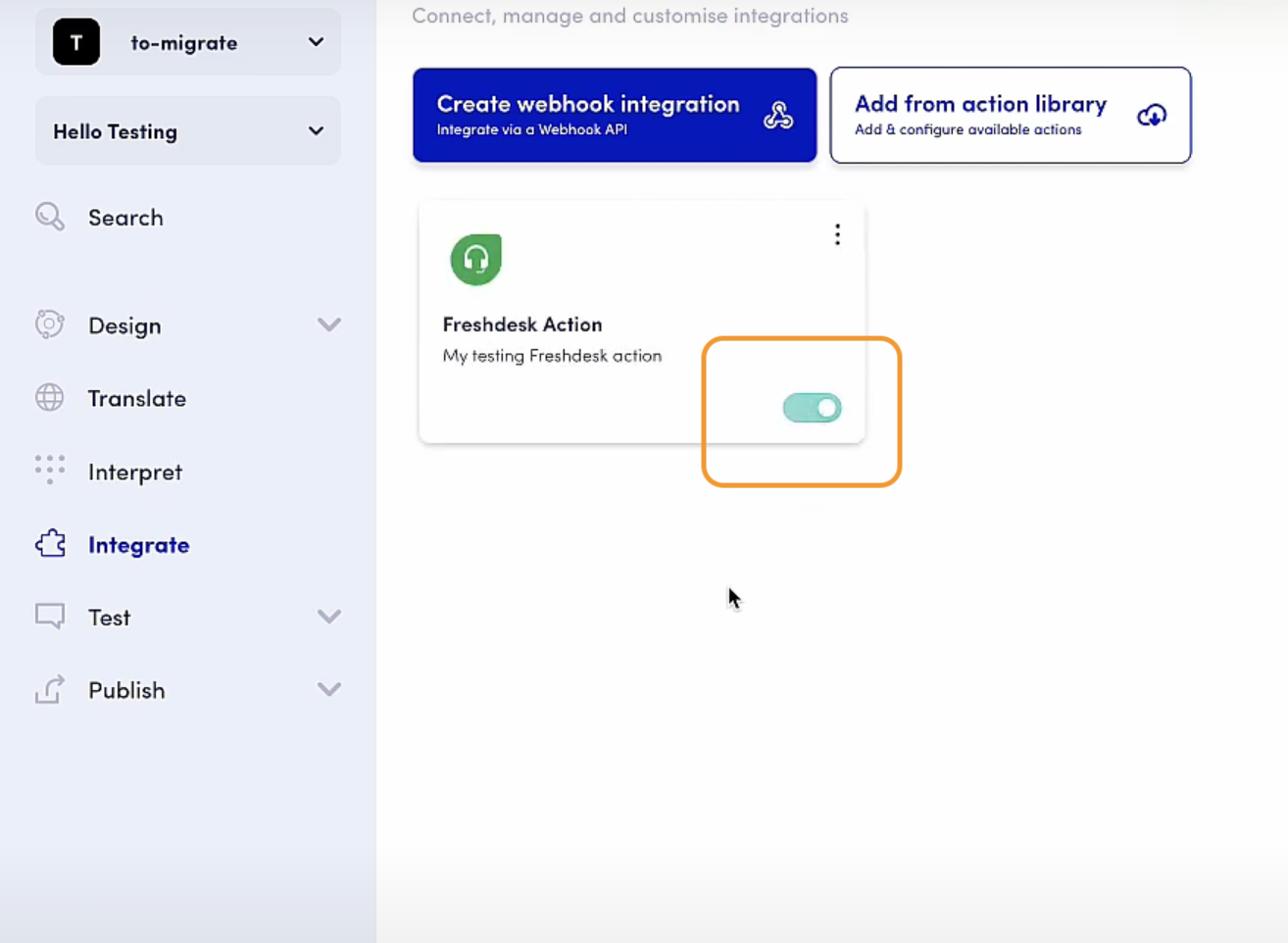 Freshdesk actions allow you to integrate your Freshdesk ticketing system into your OpenDialog scenario; you can therefore find it under our product's Integrate section.