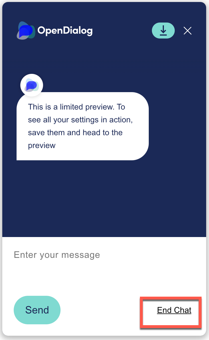 Clicking on the **End Chat** button generates an intent to end the chat. Similar to no match and restart, the conversation engine will look for an intent.core.TurnEndChat intent in a turn in the current scene. If no intent is found, the engine will look for an intent.core.SceneEndChat intent in the conversation, and if no intent is found, the engine will look for an intent.core.ConversationEndChat.&#x20;