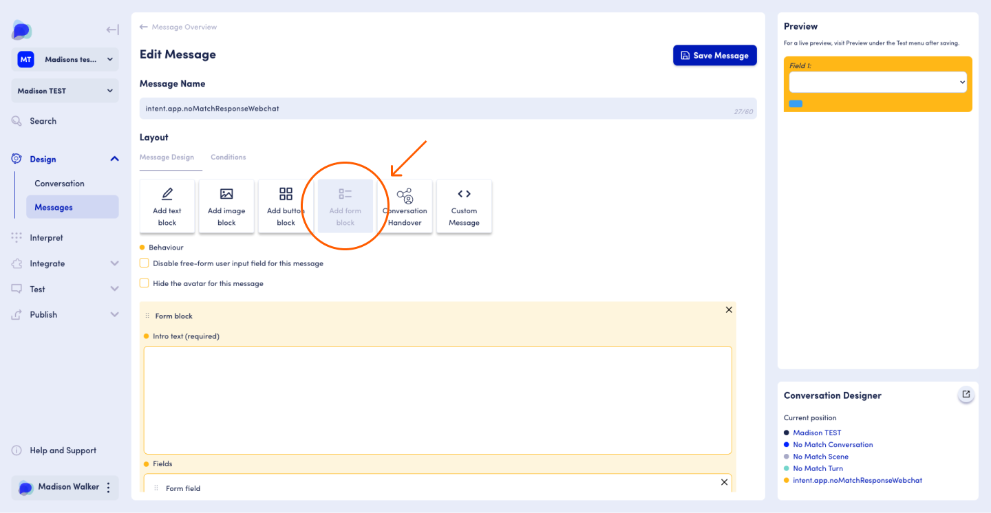 Navigate to the [Message Editor](https://docs.opendialog.ai/opendialog-platform/conversation-designer/message-design/message-editor) and create a form block by clicking the *Add form block* icon in the Layout section.