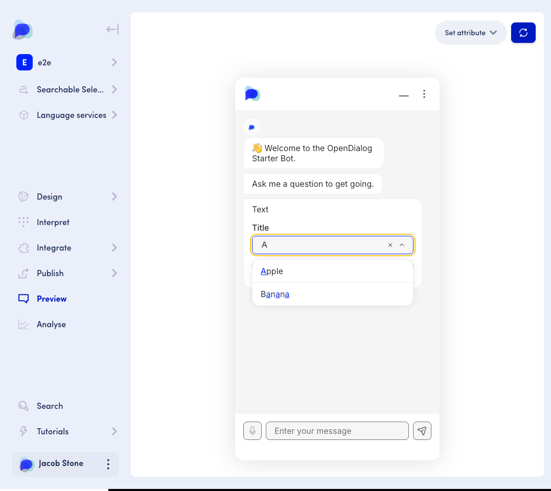 When creating a form message in the Message Editor, there are two ways to provide dropdown options. The first, is by manually providing a set of static options. The second way to do this is via a [collection attribute](https://docs.opendialog.ai/core-concepts/contexts-and-attributes/about-attributes#multiple-value-attribute-types-collections-and-composites), populated by a fetch operation from a [webhook action](https://docs.opendialog.ai/opendialog-platform/actions/webhook-action).