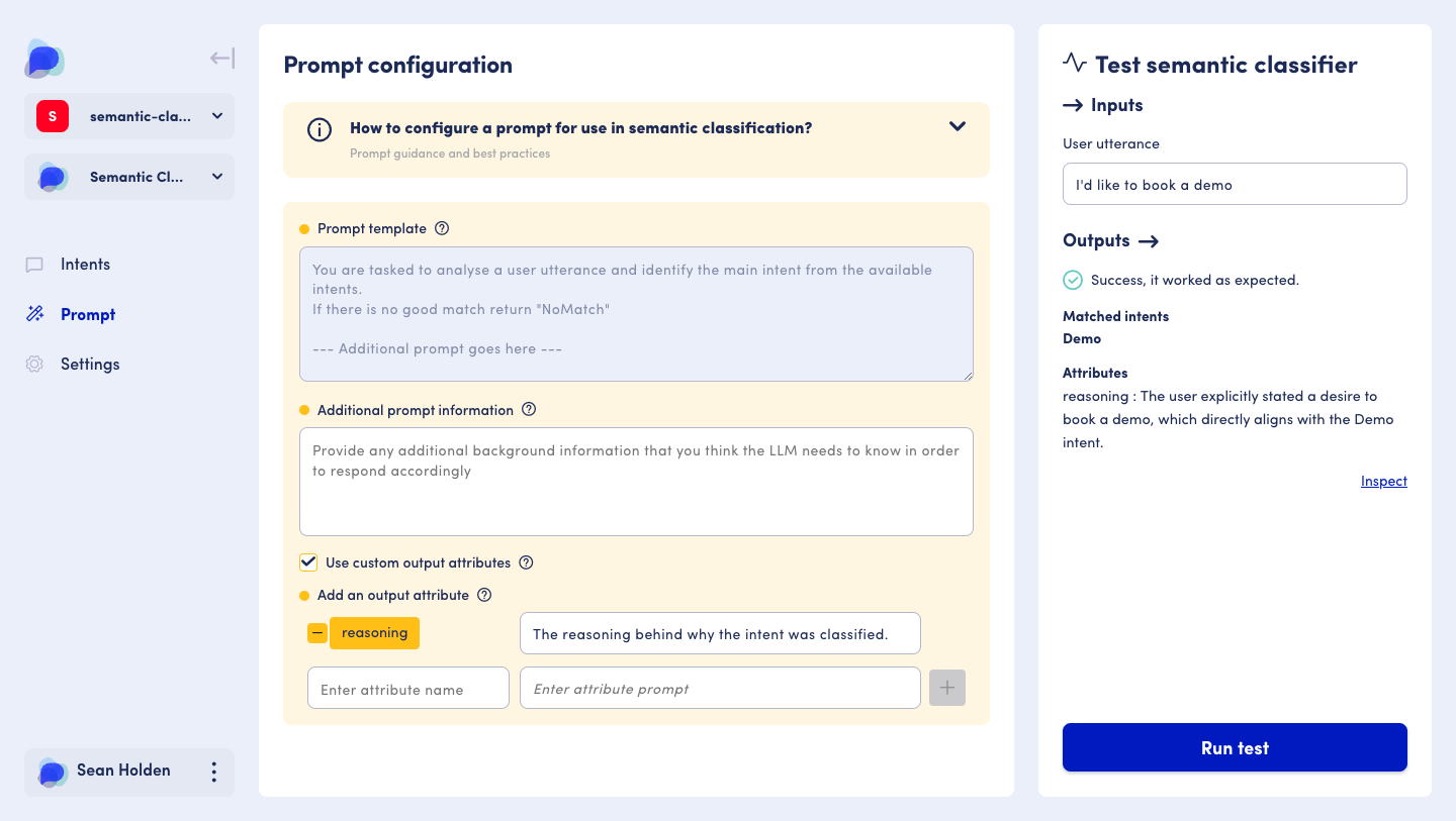 A persistent test panel is present in both the intent creation screen, and prompt screen, so you can test and iterate your Semantic Intent Classifier throughout set-up, and more collectively as a whole.