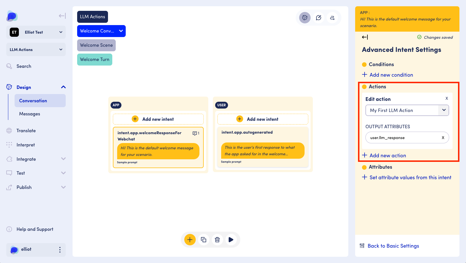 To use your OpenAI LLM action in your scenario, you can add it to an intent in the Designer.