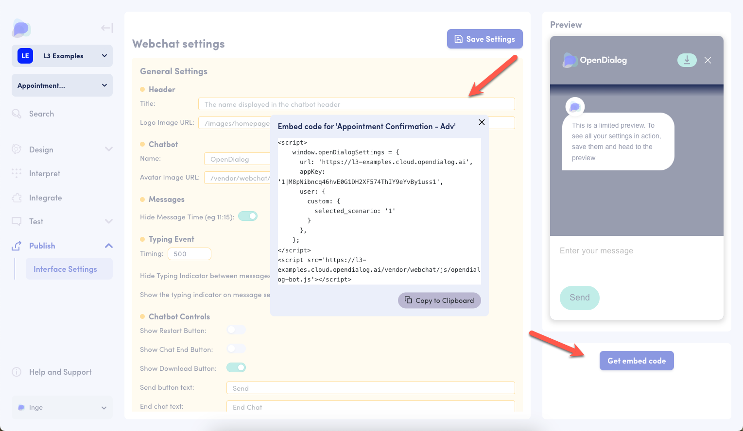 Next, go to Interface Settings under the Publish menu and click "Get embed code". Copy the embed code. &#x20;