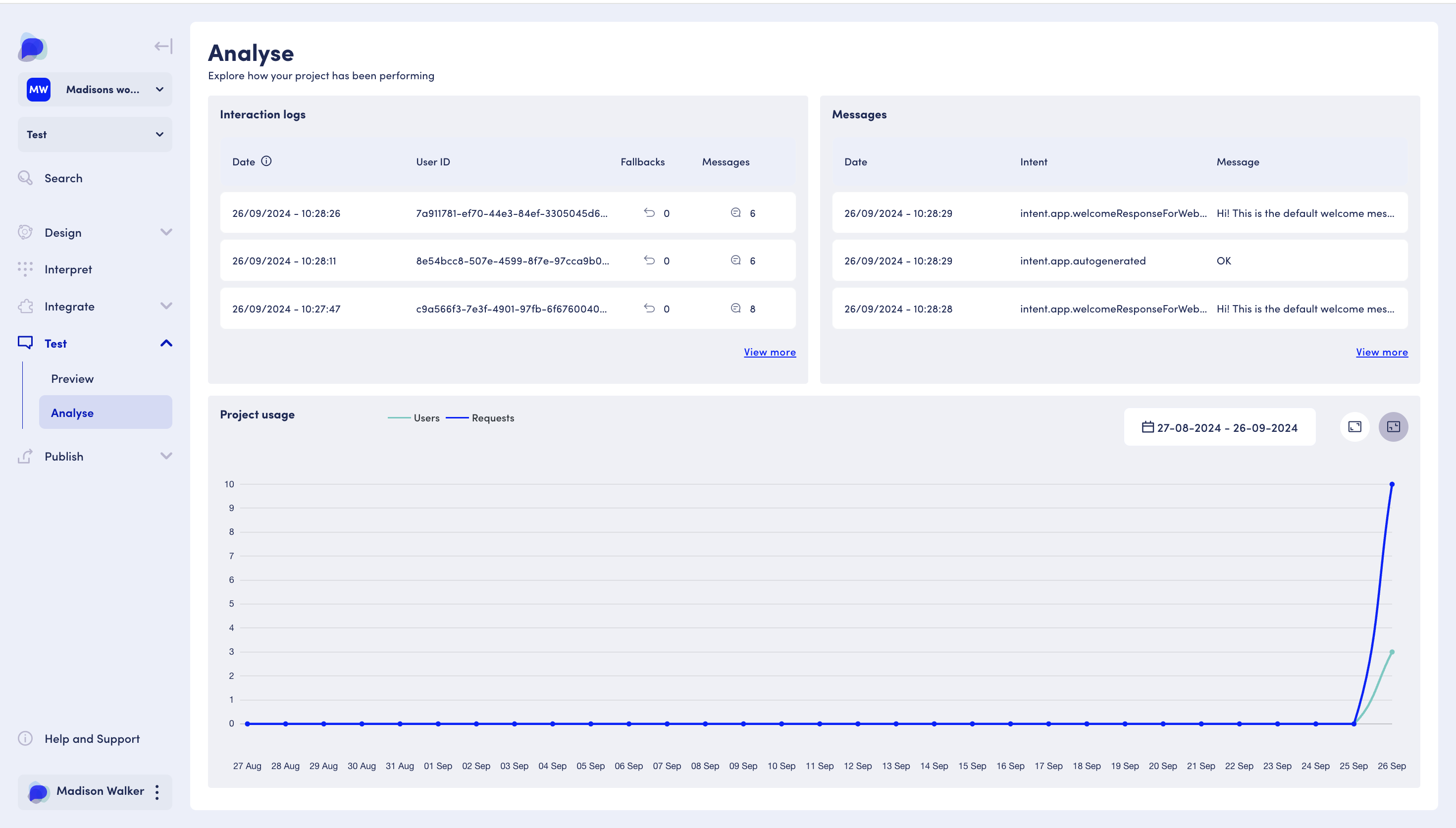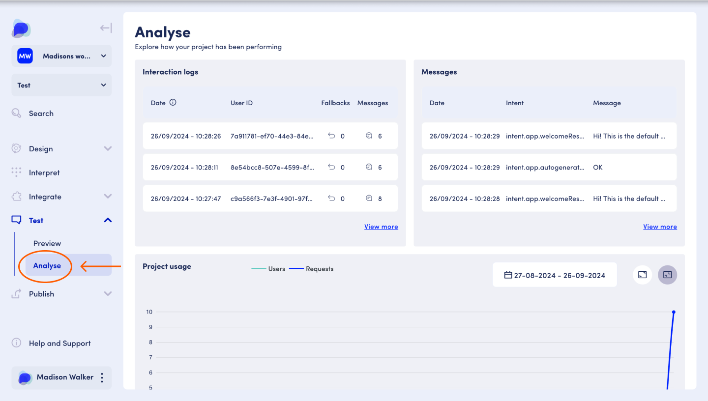 Analyse provides you with a visualisation of the application's interaction logs, project usage over time, message logs, detailed conversational history per user, flow visualisation and dialogue management insights.