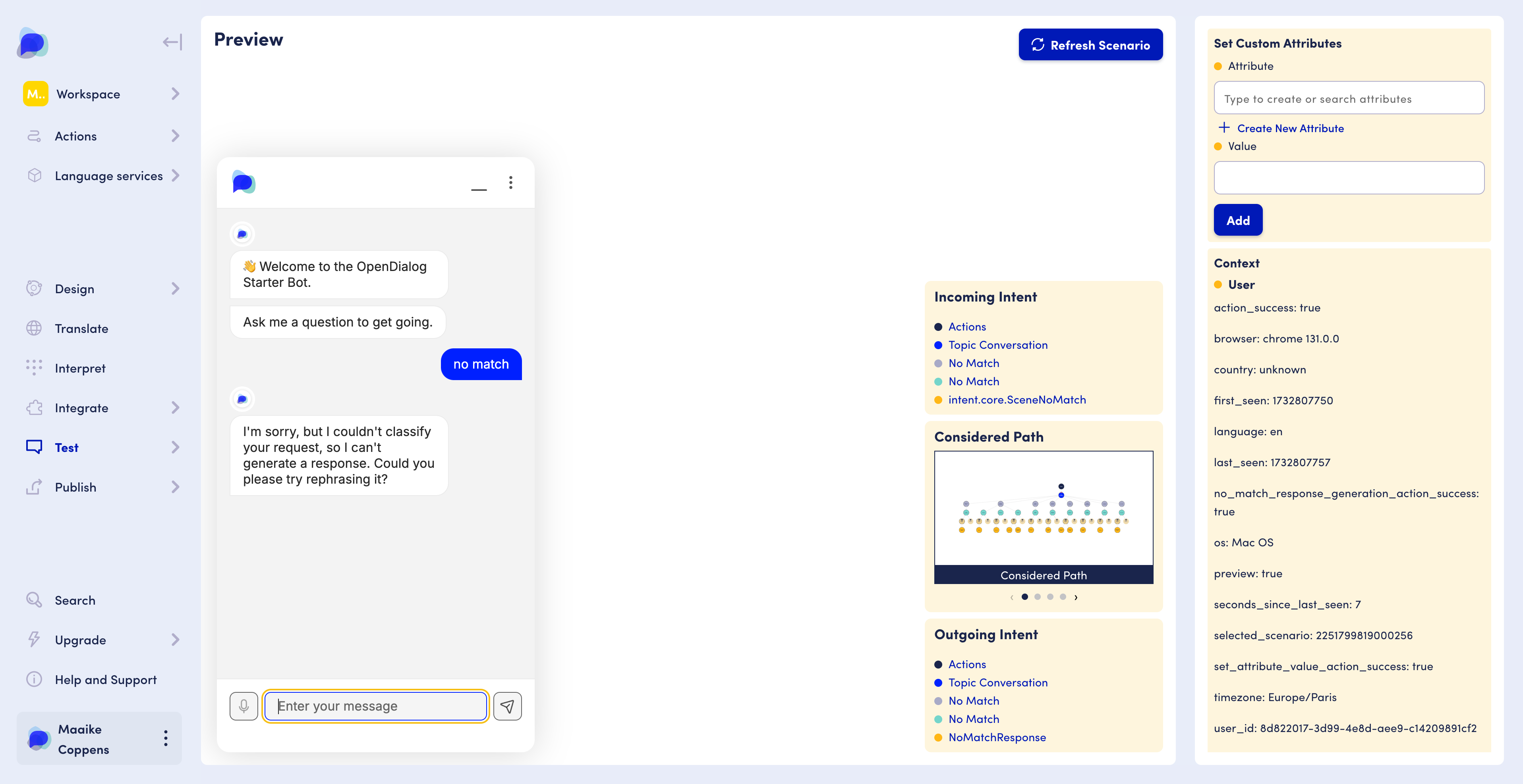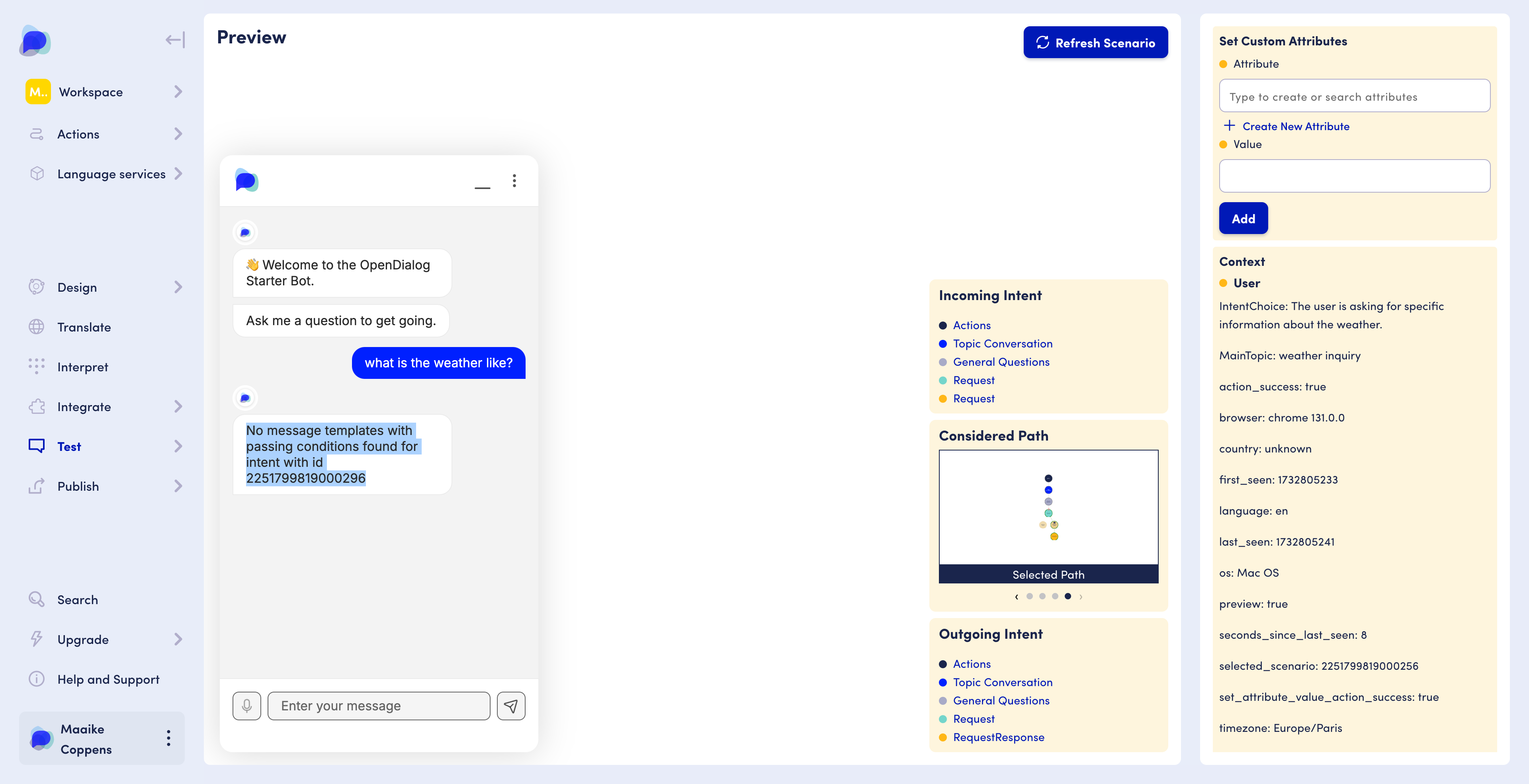 In this section we will dive deeper into the different tests you can run within the OpenDialog platform and what tools can help you debug issues or improve the quality of your AI Agent.