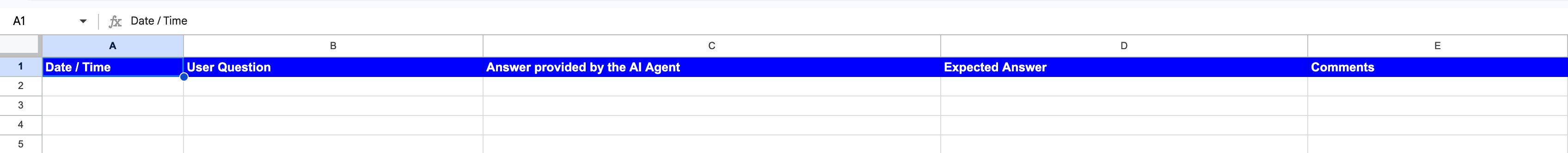 <figure><img src="https://3203401256-files.gitbook.io/~/files/v0/b/gitbook-x-prod.appspot.com/o/spaces%2FdP6xFXXyeBbibro1Ywnq%2Fuploads%2FDkVcsL9Q8hmrulOQz2ux%2FAIAgent_testsheet.png?alt=media&#x26;token=66b7bc1d-26a9-4e99-ac93-68abdf5701db" alt=""><figcaption><p>Example of the setup of an AI Agent test sheet</p></figcaption></figure>